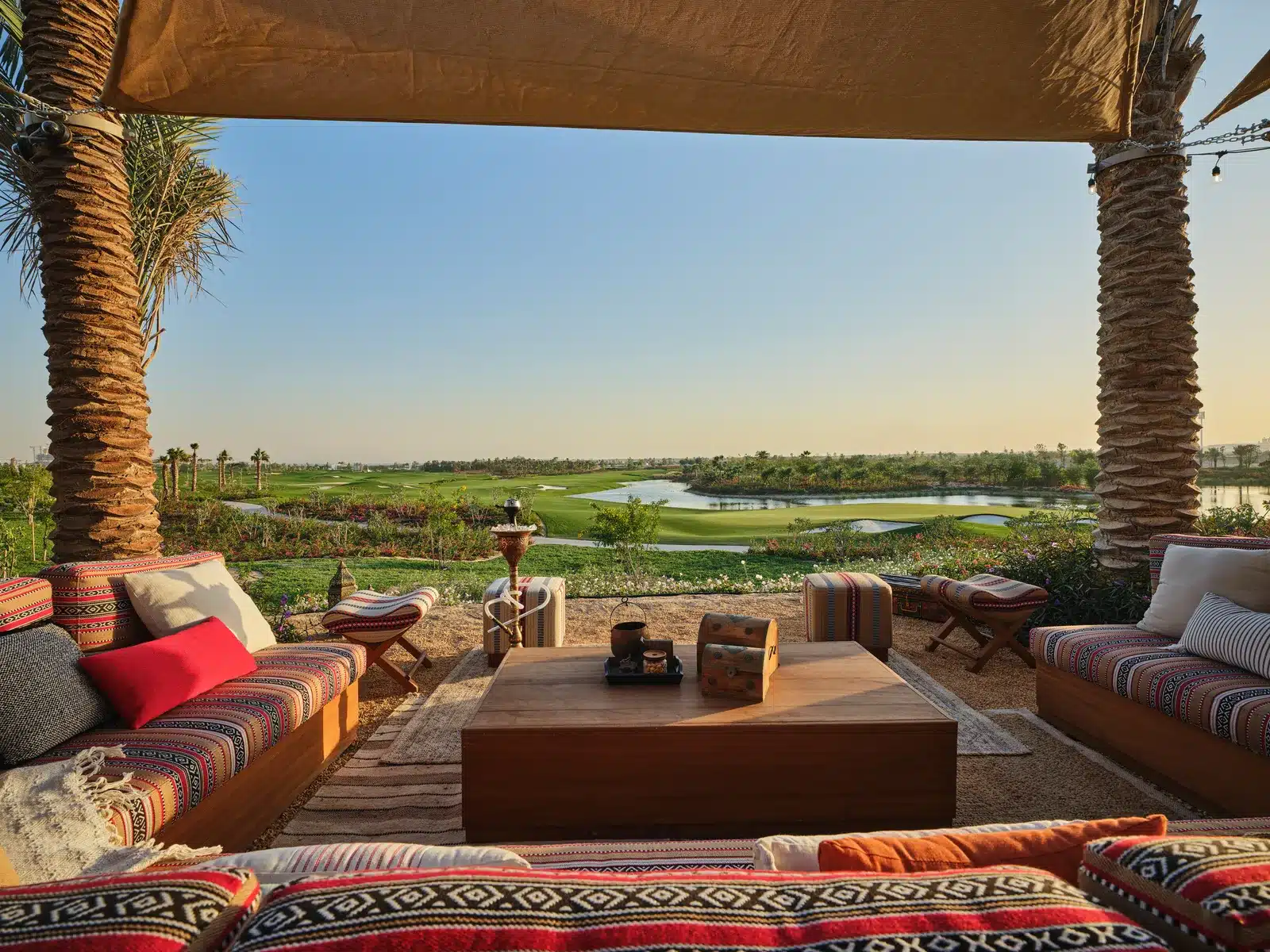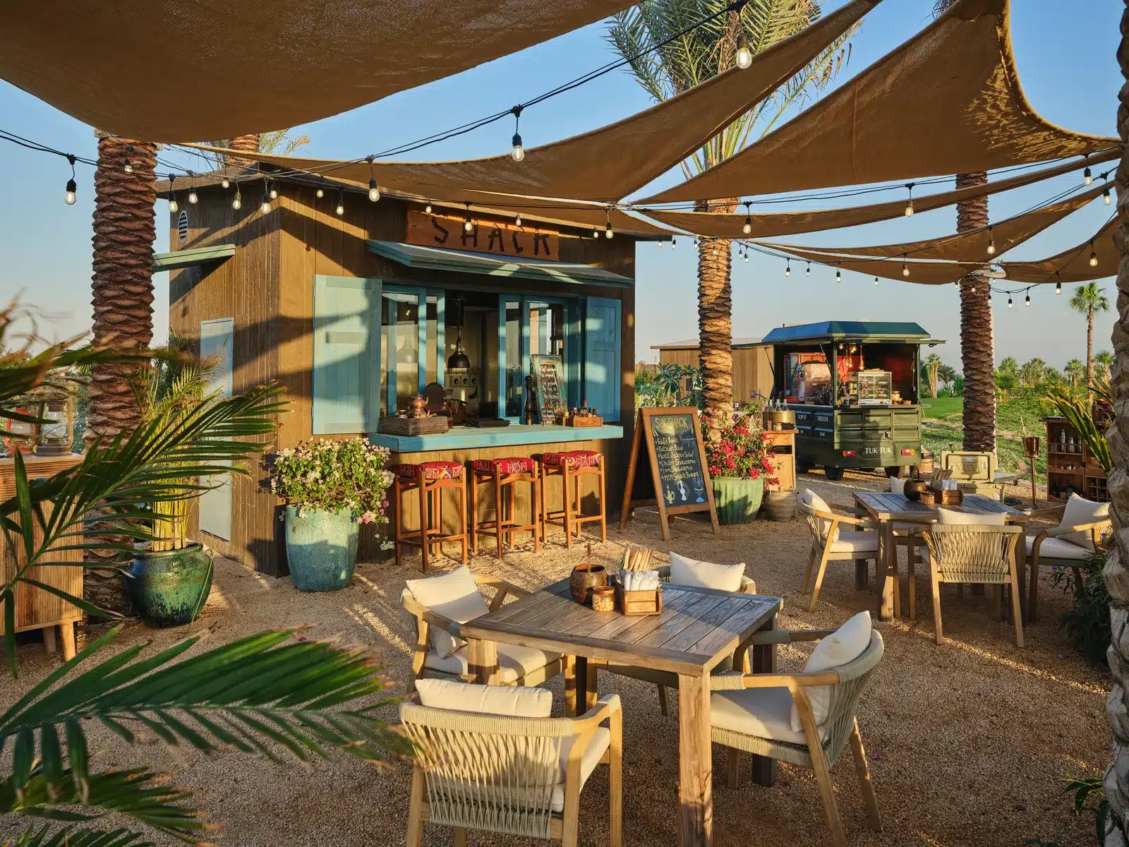 While the comfort stations provide sculptural pauses, Discovery Dunes has also introduced a series of informal gathering spots known as the “Hangs”, relaxed, social spaces inspired by the American tradition of simply hanging out. The Lake House overlooks the 11th hole, while SHK Shack sits between the ninth and tenth, serving shawarma and Tuk Tuk coffee beneath string lights and palms. With majlis-style seating, open-air counters and a deliberately casual feel, they extend the same logic of ease and connection beyond the architecture.