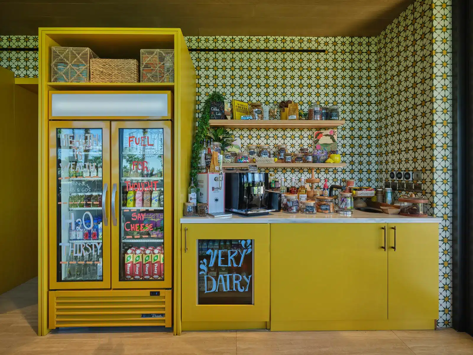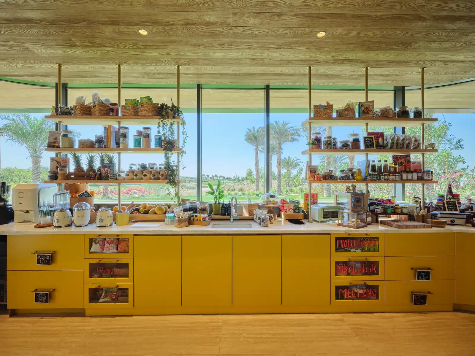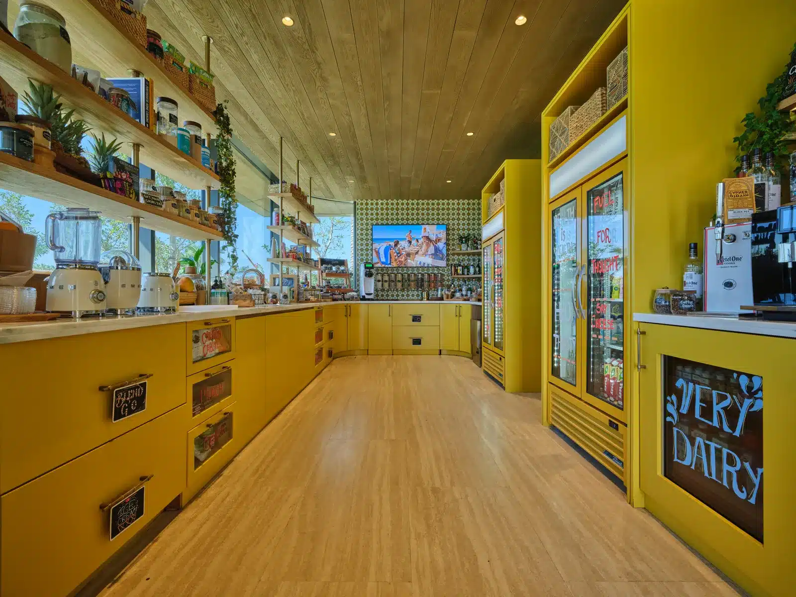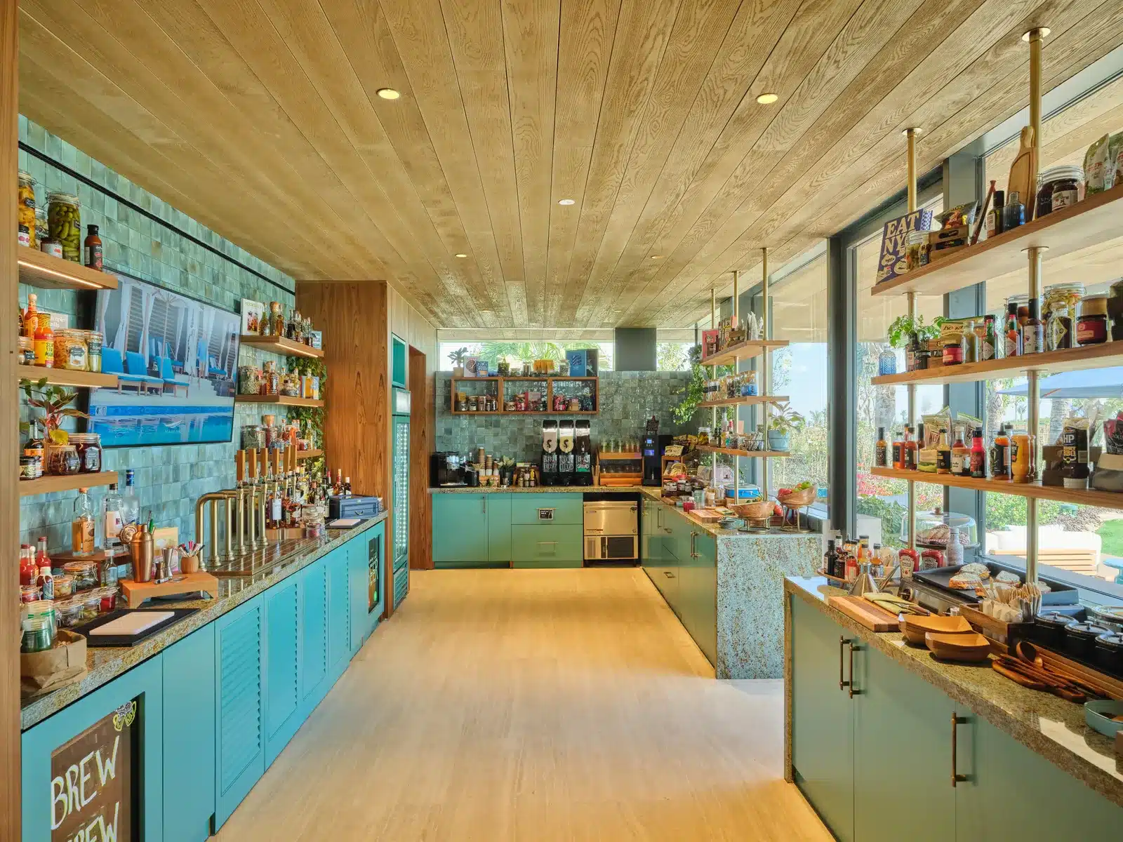 Killa’s material palette underscores that restraint. Natural stone, timber‑lined soffits and deep, flat roof planes provide shade and thermal mass, while interiors feature warm timber ceilings, stone or travertine floors and open shelving more reminiscent of a domestic kitchen than a commercial facility. At the first station on the fifth hole, dubbed Tee Top, the landscape even extends over the roof, allowing golfers to tee off from a grass‑covered canopy. Inside, players find breakfast burritos, fruit‑packed açaí bowls and cold brew on tap, an “unexpected twist” that captures the informal character of the course. The second station, Tap Room, on the thirteenth hole, frames panoramic lake views and offers smash‑burgers, global snacks and handcrafted beverages in a cooler palette of blue and teal tiles.