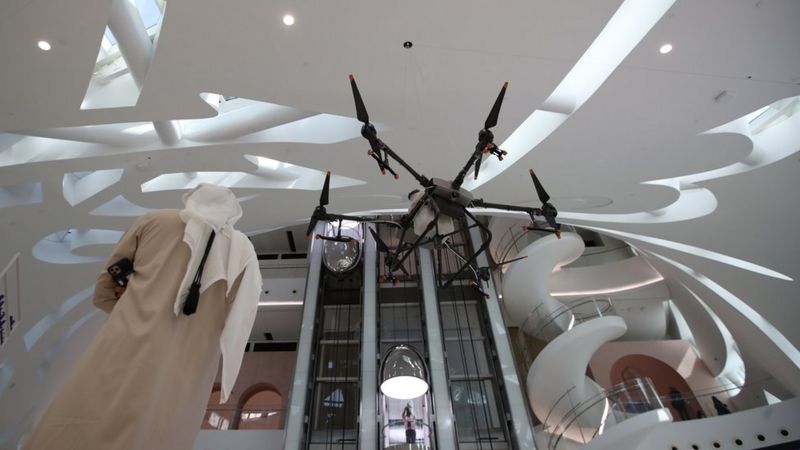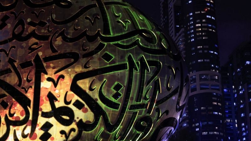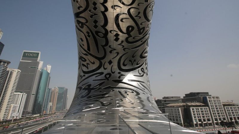 The outside of the building is covered with quotes in Arabic calligraphy, including ‘the future belongs to those who can imagine it, design it, and execute it’, words of Dubai’s ruler Sheikh Mohammed bin Rashid al-Maktoum.