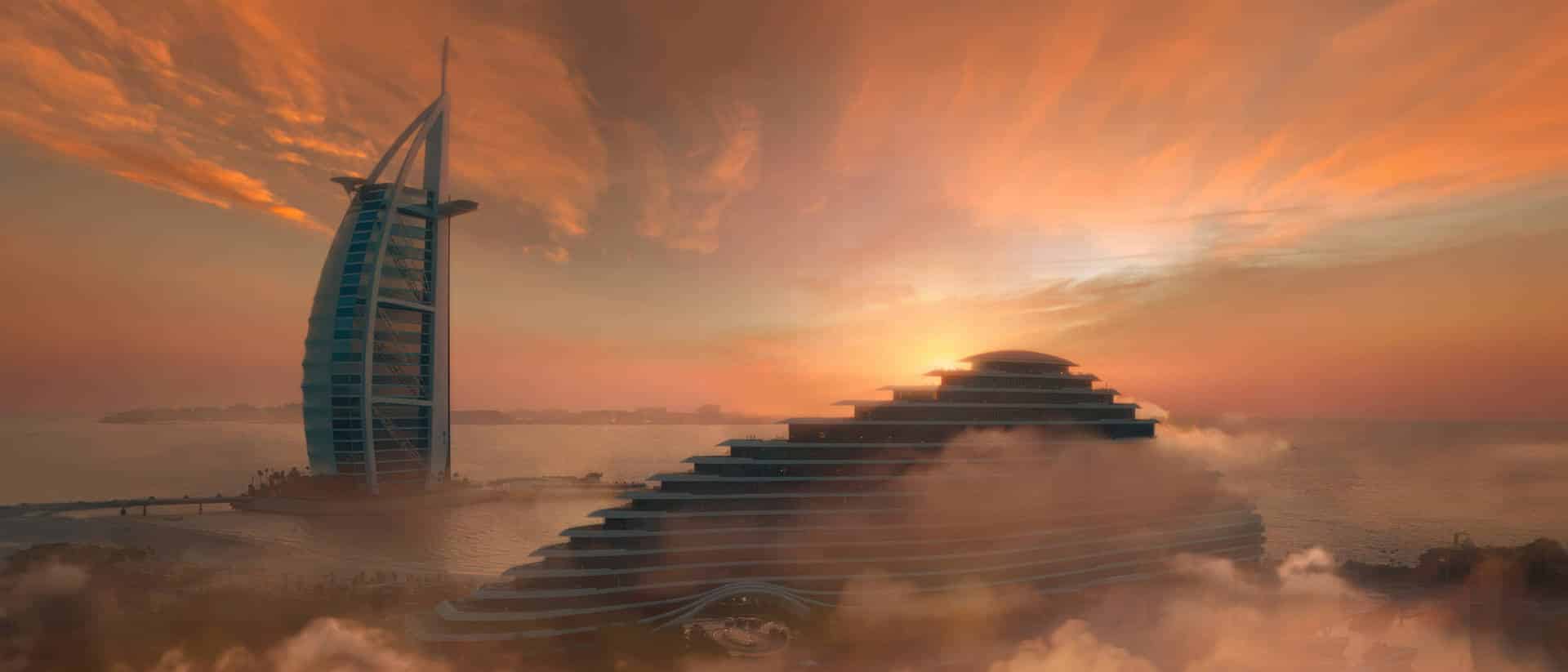 ”We’ve positioned the arch to be perfectly aligned with the Jumeirah Burj Al Arab and the sunset beyond, to create a picture-perfect moment where architecture and setting come together seamlessly,” Killa explains.