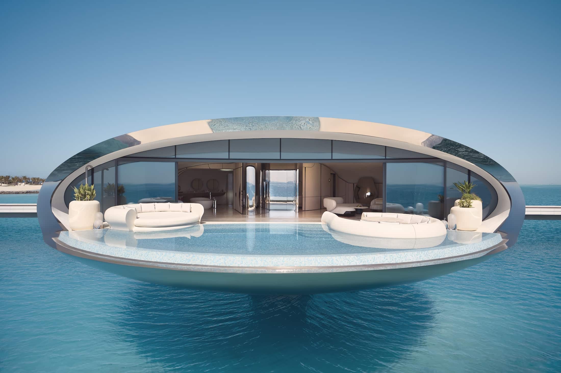 Designed by Studio Paolo Ferrari, Shebara’s interiors embrace a philosophy of ‘Natural Futurism,’ straddling futurism and timelessness. Drawing inspiration from the protective shell of a sea urchin, Ferrari’s team crafted interiors that contrast the orbs’ sleek exteriors with soft, cocooning spaces. The studio leaned into aerodynamics and movement to create soft and tailored interiors. With the sea’s vibrant blues outside, the studio embraced a restrained interior palette, allowing nature to take centre stage. “Our idea is to frame the water, and to let nature be the real focus,” shares Paolo Ferrari, the studio’s founder. Echoing the precision of yacht and aviation design, Shebara’s interiors are meticulously crafted. Curved surfaces necessitated advanced 3D modelling techniques to optimise space and ensure the seamless integration of furnishings. “How we maximise space in a villa like this is similar to how you design a private jet or yacht, where you have to maximise every square inch,” says Ferrari.