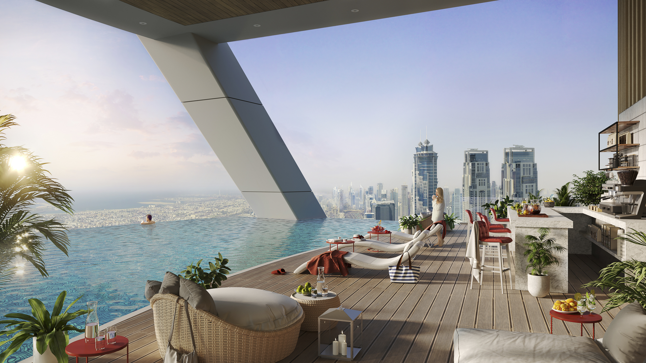 Standing over 300 meters tall, Safa Two offers a collection of unique luxury apartments, all boasting stunning views of the Dubai Water Canal, Safa Park, and the Arabian Gulf. The rooftop is dedicated to extraordinary experiences, including an indoor fog forest, a skyline observatory, and expansive terraces with panoramic views of the city. Residents will also enjoy beach-style pools, spacious green terraces, and sensory relaxation areas throughout the entire building. The centrepiece of Safa Two is its floating, fully translucent infinity pool—a truly awe-inspiring feature designed to offer a serene escape high above the city.