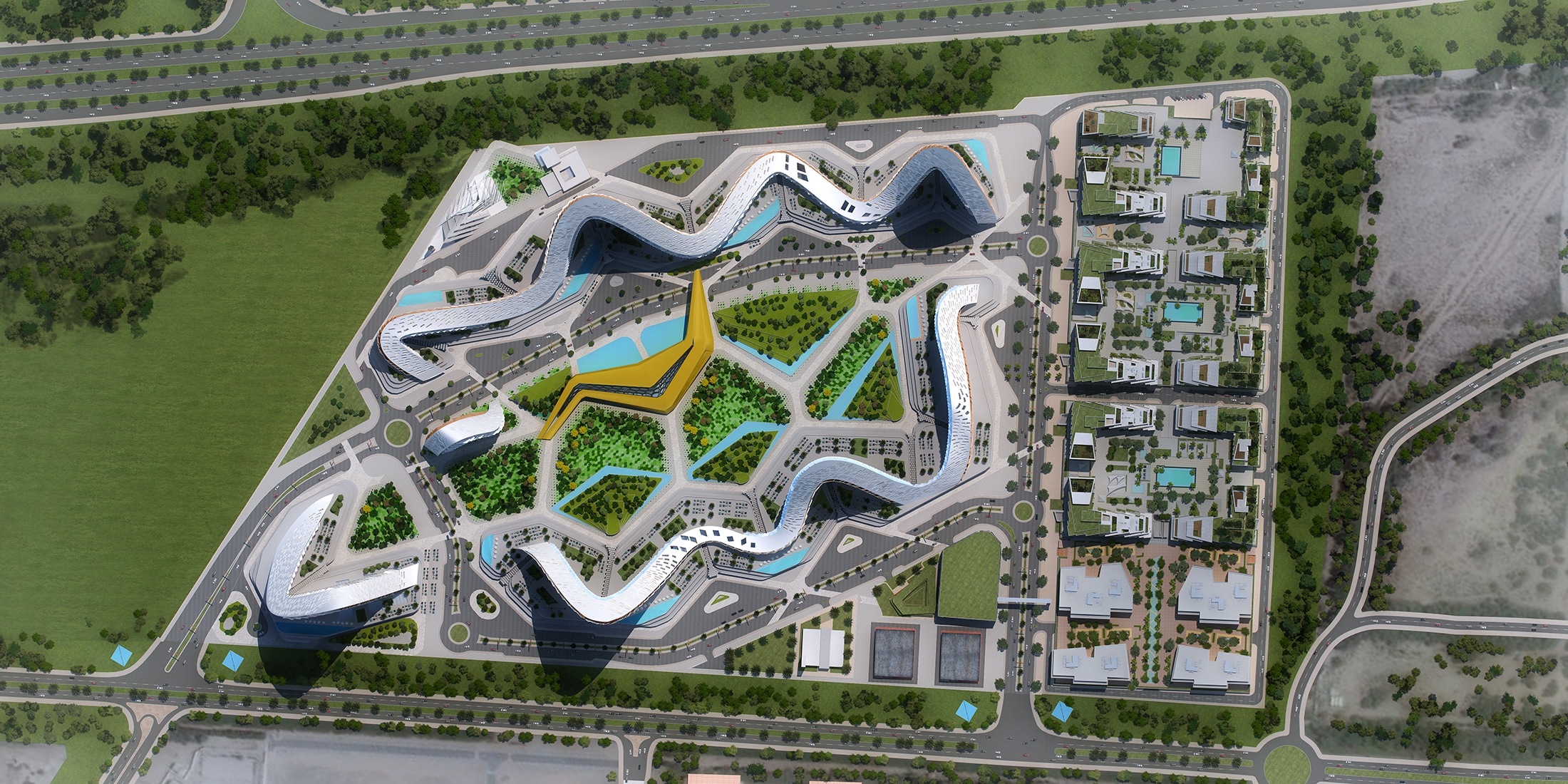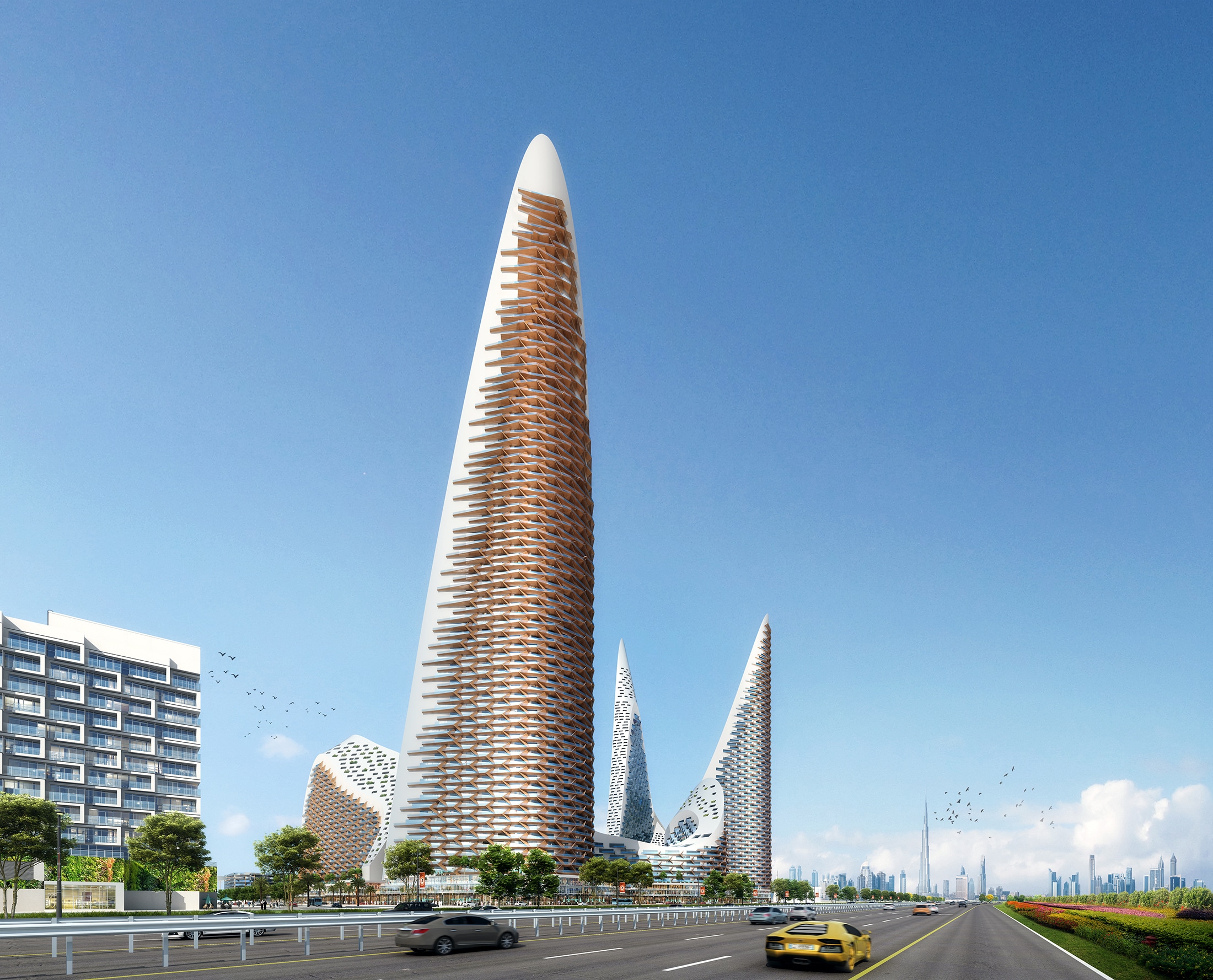 Sinuoso, the Italian word for ‘a curvy and winding path’, is a mixed-use development which was re-designed to upgrade the design and increase its potential property value. The plot includes a residential complex, commercial buildings, a hotel and serviced apartments, in addition to community facilities such as gyms, supermarkets, clinics and a community mosque. The re-design proposes a Lamborghini Museum within the plot.